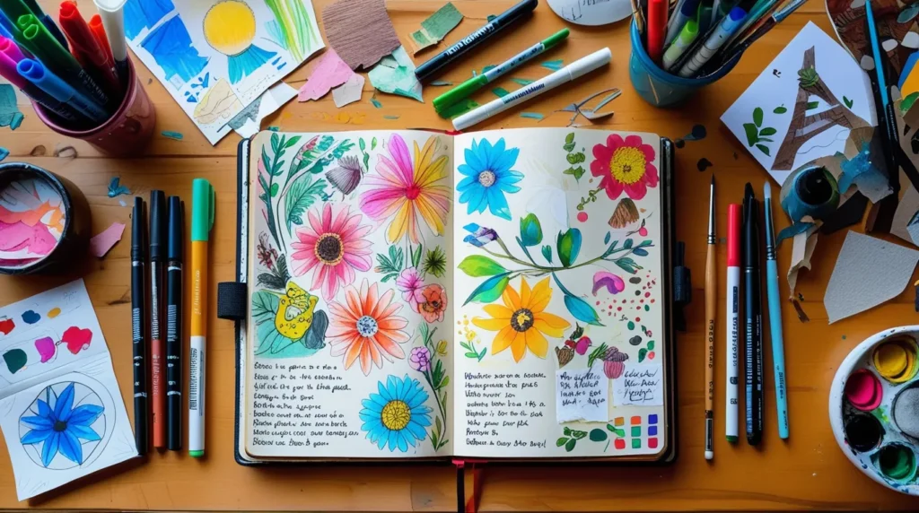 Creative journaling blends writing, art, and self-expression in a personal notebook. Pages can include: